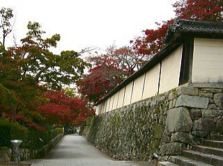 比叡山は諦めた。日吉大社への途中で、穴太衆積みと紅葉の見られる場所に寄ってもらった。坂本の寺院はどこも穴太衆石積みばかりとか。写真は、里坊の総元締だという立派な滋賀院門跡の門前。 里坊とは、比叡山で修行して高齢になった僧の住まいである隠居所で、比叡山麓の坂本に56残っている。 西 教 寺 西教寺にもまわってみた。旧竹林院の看板の出ているところから入ったので、名庭園の鑑賞かと思ったが、行ったところは普通に立派なお寺だった。 右写真ではほとんど見えないけど建物の間から見えた琵琶湖。かなり上がってきたようだ。 ここも、延暦寺ゆかりの寺で、天台三本山といわれ、延暦寺や園城寺(三井寺)と並んで天台真盛宗の総本山とか。歴史は古いらしく、聖徳太子や平安中期の僧、良源や源信の名も挙がる伝説があるらしいが、盛んになったのは中興の祖と言われる真盛からだとか。 延暦寺本堂の紋として使っていた菊の紋を皇室にゆずったとか、延暦寺と同じく猿は神の使いとしてあがめられ、本堂の屋根の両隅に猿の像が乗っているとか、明智光秀とのかかわりが深く、芭蕉の句碑、光秀の妻や一族の墓などがあり、見どころいっぱい。 お目当ての紅葉は・・・無くはないけど・・・