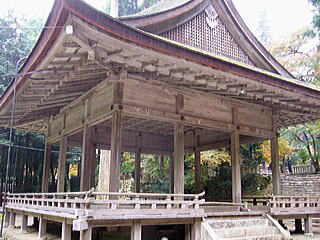日吉大社の歴史は古く、古事記に「大山咋神、亦の名を山末之大主神。此の神は近淡海国の日枝の山に坐し」とあるのがここのことだとか。 牛尾山(八王子山)山頂に磐座があり、これが元々の信仰の地であり、そこには奥宮(牛尾神社・三宮神社)があって、現在の東本宮はその里宮として創祀されたものとか。十数年前にその奥宮に友人とハイキング気分で登ったことがある。(古い記事はこちら)小さいけれど立派な舞台造りのお宮で、神輿が納めてあると聞いたが、むしろ日吉大社の元の本宮だったのか。 駐車場から遠くなるし、大分坂を下りて上らなくちゃならないようで、雨が本降りになってきたし、東本宮に行くのをやめて、西本宮だけゆっくり見て歩いた。 本殿と拝殿は、熱心に拝んでいる人がいたので写真はやめた。上写真の右側建物は白山宮。左側に写っている小さい宮より左に宇佐宮。どちらも縁の両端に狛犬が座っていて面白い。昨年行った赤山禅院と同じ。京の鬼門ということと関係があるのだろうか。