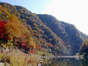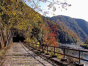 2005年11月21日(月) 晴れ 2005年秋紅葉、近場散策第4回は、武庫川渓谷、廃線跡ハイキング。旧国鉄福知山線の宝塚〜武田尾間が今では新しいまっすぐルートができて、 トンネルいっぱい単線の旧線は廃線となった。以前はあちこちに、歩行禁止とか責任取りませんとか、大きな看板が出ていたが、何故か放り投げられてあったり、なくなっていたり。だけどやっぱり、本来鉄道用にはきちんと整備されていたけれど、まったく整備されなくなったトンネルと鉄橋を通るわけで、歩く人はあくまでも自己責任という立場を忘れてはいけないだろう。今日は武田尾側から歩くことにした。