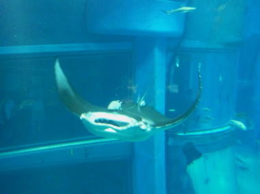 ジンベエザメやいろんなエイなどがいる一番大きな水槽は‘太平洋’と呼ばれ、実際の海では魚同士が会うことは滅多にないのだろうなと思いながら小魚からサメまで遊泳する姿を楽しませてもらった。 海遊館入り口を入ると、長いエスカレーターで先ず8階まで連れて行かれ、日本の森が海を育てるところから始まり、世界の海をいくつかの海域に分けて、それぞれに適した環境の展示になっている。見学者は建物の中心‘太平洋’をまわって下りながら、壁側の水槽も見てまわれるようになっている。 それぞれ結構深い水槽になっていて、アシカが上から下から近づいてきたり、イルカのボールショウを陸上も水中も同時に見学できるのは楽しい。8階から4階までぐるりとゆっくり、好きなところで椅子に座って眺めていることもできる。混んでいるときにはゆっくりは無理だろうけど。