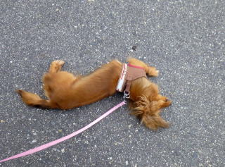 今日の写真2枚は、記事とは直接関係のない、散歩でミミズの干物に夢中でからだを擦り付けているところです。少しは食べたようで・・・。