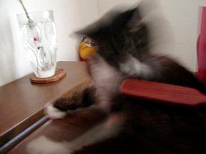 最初、じっとしていても、硬い毛のブラシだと噛みついたり猫パンチで弾き飛ばしたり。