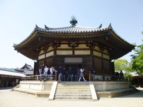 ![]() 夢殿 春と秋の2回、特別公開される救世観音像が 真正面の扉の開いたところから厨子に入った姿を拝観できます。 こんなに全身金箔だったっけ?と毎回自分の記憶の怪しいことにがっかりしながら 今回が最後の拝観になるかもとじっくり見せていただきました。 こちらの観音像は、中宮寺の半跏像の観音と違って、見るからにアルカイックスマイル。 やはり樟造り。漆で金箔を貼ってあるとか。1300年間この黄金色を失わずに保存されていたことに驚きます。 世界で一番古い木造建築という同じ法隆寺の西院伽藍建造物群より、 こちらの東院伽藍は、夢殿が聖徳太子を供養する八角堂であっただろうと言われ、 少し新しいようです。
