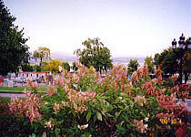 対岸の街は川から一挙に崖になった丘に広がっています。こちら岸もそうなっているようです。シャトーフロントナックの前は、提督の散歩道からつながった広い広いウッドテラスの広場(テラス・デュフラン)で、板の隙間から足下の崖が見えます。日本なら地震の心配をしそうです。