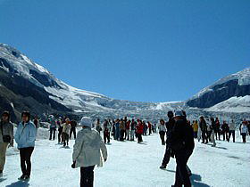 ハイウェイのそばの大きなレストランで昼食をとった後、アサバスカ氷河の中ほどまでスノー・コーチなる雪上車に乗っていって、しばらく氷の上で遊びました。 氷河というのは、普通の氷でも雪でもない、硬くてざらざらして、300メートルの厚さがあるというここでも、透明感はあるけれどそれほど下まで見えるわけではありません。表面で溶けたところは小さな流れになって、カワノさんにもらった紙コップでその水を飲みました。何万年も前に降った雪が凍った分かなぁ?・・・ちょっと感動。 自然のままを大切にするカナダで、大勢の人間が氷河の上まで車で行って観光することに、やはり批判はあるようでした。鉄のキャタピラを使わずにタイヤにするなど工夫してはいますが、いつか禁止になるのだろうな。 ジョンストン渓谷、ミニハイキング