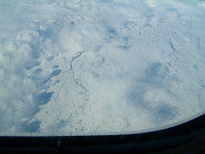 しばらくすると、大地が白っぽくなりました。雪か氷に覆われているのでしょう。北欧辺から北極海に出てアイスランドへ。