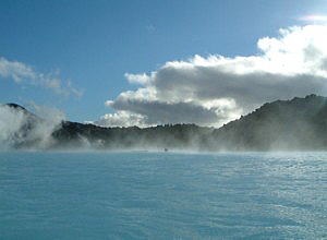 アクアブルーというけれど、キラキラ反射する白っぽい水色は不思議な色。 湯気がゆらゆら昇っています。