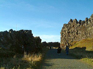 溶岩の崖の上から見た地球の裂け目です。随分広いのに驚きます。裂け目はギャウと呼ばれて幾筋も走り、岩を分かち、水をためて、今も毎年2センチずつ離れてアイスランドは東西に幅を広げているのだそうです。写真の左側、今自分が立っている場所は北米プレート、川の向こうがユーラシアプレート。バスは私たちを下ろした後、川向こうに行って待っています。ここシンクヴェトリル国立公園は世界文化遺産に指定されています。なんで自然遺産じゃなくて文化遺産?