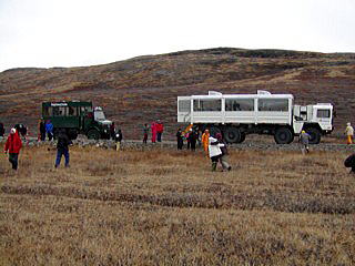 遠くから眺めるのと違って、歩くとなると、表面には溶けた水がたまり、雪のすぐ下の氷は透明で固くすべりやすい。多分気温は氷点下何十度。強風に吹き飛ばされそう。ふたり一組で腕を組み、順番に前の人の後ろを進みます。こんなところで滑って転んで足をくじいたり折ったりしたら大変。きっとここには手当てのできる病院などなくて、東側海岸沿いの町まで行かなくちゃならないのでは。慎重に慎重に79歳の元気な女性と腕を組んで歩きました。