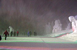 スキーのゲレンデで樹氷見物ですから、スキーヤーの邪魔にならないように、夜か早朝しかだめなんだと分かりました。ライトアップやむなしなんですね。軽い吹雪で、ウールのストールでほっかむりをしていても、下から吹き付ける風と雪で顔のまわりが凍って、ほんの少しの間だけれど、雪山の感じを味わえました。