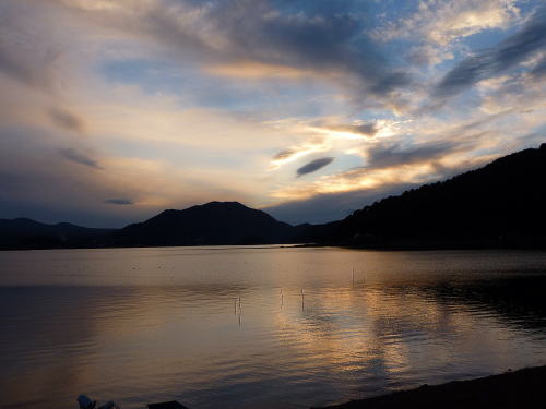 一列に並んだ四湖のうち東端の河口湖は、周囲が19.08mと五湖では一番湖岸線が長い。海抜は一番低く833m、水深は15.2m、面積は6.13平方キロ。