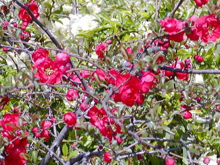 | 紅、白、ピンク、ボケの花 |