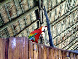 ボートから天然イグアナが土の上にいるのが見えて大喜びしたら、そこは私たちのロッジの敷地のなかでした。その後“おさるさんの果物”の木にのぼって、撮影のモデルをつとめてくれました。案外小さいからだながら、太くて長いしっぽ。背中のたてがみ?草色の体色に、恐竜時代生き残りの風格がありました。
