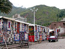 濁流渦巻くウルバンバ川を裏に見て、中庭風のところに、民族服を身につけた女性が3人、芝生の上に座り込んで、子供を横におき、原始的な織物機で、肩掛けとも敷き物ともいえそうな織物を織っていました。