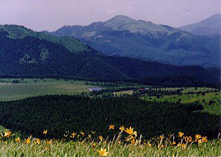 ニッコウキスゲに覆われた霧ヶ峰高原・車山から、左写真の真ん中がそうだと、はるか下のほうに眺めたのが八島ヶ原湿原を知った初めでした。