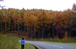 4日目 2003年10月23日(木) 晴れ 時々 曇り 八ヶ岳山麓別荘地内散策 雨が上がり、柔らかな朝日が落葉松と赤松の林に射し込んでいます。