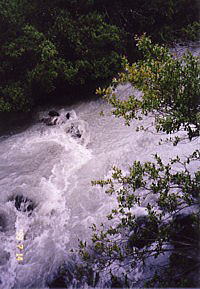 今日は列車で登って来たほとんどを歩いて下ります。下り始めてすぐに雨は止み視界が開けてきました。まわり一帯ちょうど3000メートルあたりに雲がかかっています。4000メートル級の山頂は見えませんが、みごとな氷河が何本も見えてきました。氷河の中に2つ青い小さい透きとおった水たまりがありました。氷河の中は青いのでしょうか。下り始めてしばらくはがれ場のようなところで、芝桜のような小さな花の群落が色形を変えて岩にへばりついたように咲いています。