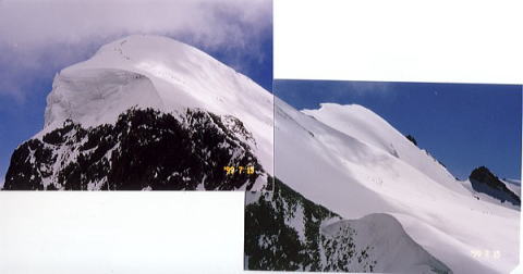 ウンターテオドゥル氷河の上を一気に登るロープウェイからの景色はすばらしく、クレバスを覗き込んで身震いします。すぐ横のブライトホルンの万年雪の上をありの行列よろしく登っていく人々が見えました。何十メートルとあると思えるこの雪の厚さ、磐石でしょうが、下から見上げると、今にも崩れそうでこわい。