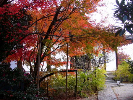 2009年11月28日(土)曇り のち 晴れ 新 薬 師 寺 若草山のほうから上って春日奥山原始林を通り高円山のほうへ下りたらすぐ新薬師寺がある。十二神将が居並ぶ様は見事というほかない。小さいが奈良時代の様式を残した国宝の金堂もすっきりした姿でいつ見ても気持ちがいい。失礼ながら境内が意外に紅葉真っ盛り。山と違う真っ赤なカエデが白い壁に映えて美しい。