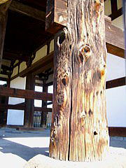 右写真は転害門の向かって右端の柱です。こんな節だらけの大柱、はじめて見ました。風雨にさらされてよけい節々が目立つようになったのでしょうが。