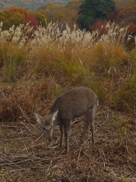 若草山山頂に着くと、ススキが穂を風に揺らし、まわりの山々が全山紅葉。わぁ〜山が赤いよぉ〜。ここで見られるとは全く期待していなかった。うれしい〜。