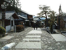 1月に見学散策した妻籠宿は、江戸時代からの建物が多く残り、宿場の雰囲気をよく残しているようでした。今回の、島崎藤村とその作品「夜明け前」で有名な馬籠宿は、明治と大正の火事でほとんど焼けて、建て直した建物群だそうです。急坂の両側に並ぶ家々を、ガイドさんは近代的というけれど、江戸時代じゃないという意味ね。坂道がきれいな石畳。なるほどそうなのかと思って見ると、確かに家のつくりも近代的かな。